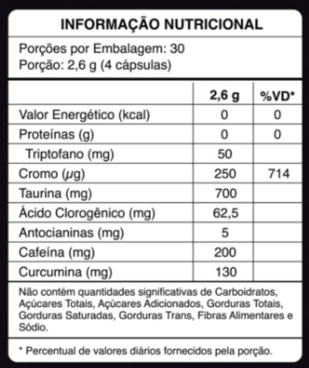 L-Carnitina, Café Verde Moído, Guaraná em Pó (Paullinia cupana), Extrato de Própolis, Acetato de D-Alfa-Tocoferol, Ácido Ascórbico, Acetato de Retinol, Picolinato de Cromo, Antiumectantes Celulose em Pó, Dióxido de Silício e Estearato de Magnésio.